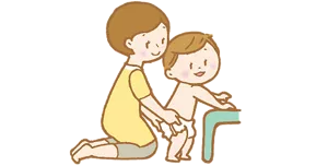 将手从学步裤的下方伸入,帮助宝宝腿部穿入。