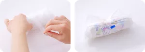如果粘有便便,请先处理干净。再将学步裤卷好,用背面的胶带粘紧,再丢入垃圾桶内。