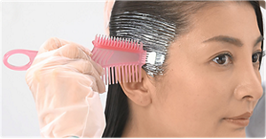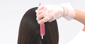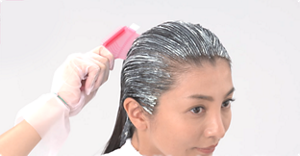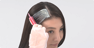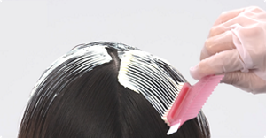 從頭頂向髮尾方向均勻梳染。 注意確保髮根位置也被乳霜全面覆蓋。