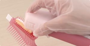 把乳霜塗抹於乾髮上 魔髮梳的彈性刷毛 能將乳霜推送至髮根