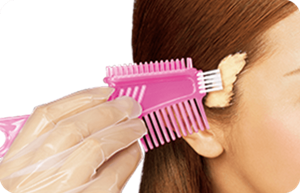 將染髮霜均勻梳染, 塗抹於乾髮