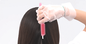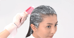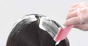 使用梳子將頭頂前半部分的頭髮均勻梳染 針對在意的白髮區域,分區後從髮根開始充分塗抹較多量的染劑。
