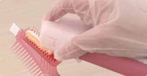 確實按壓壓頭至底,保持與梳子平行、 均勻將染髮霜擠出於梳子上。
